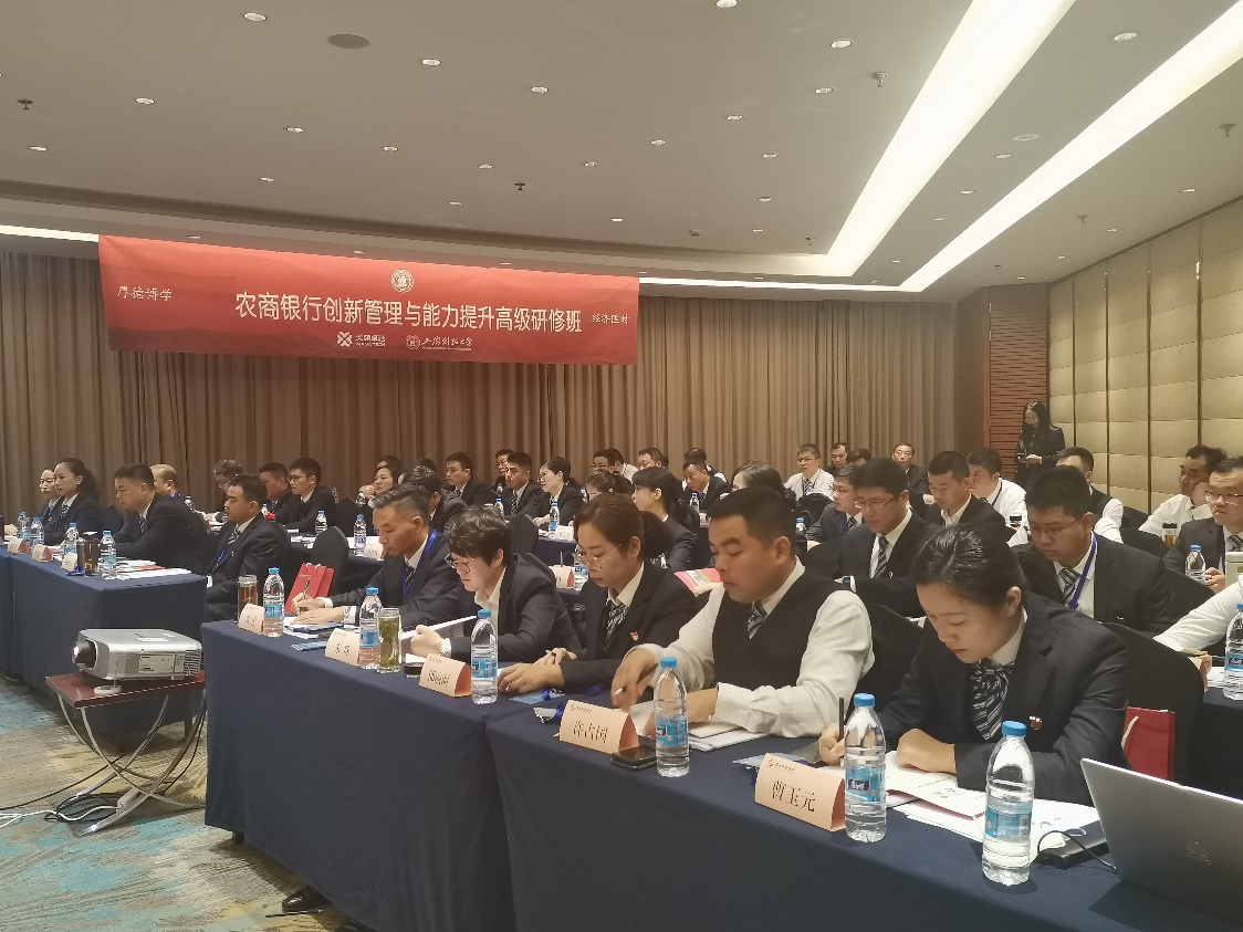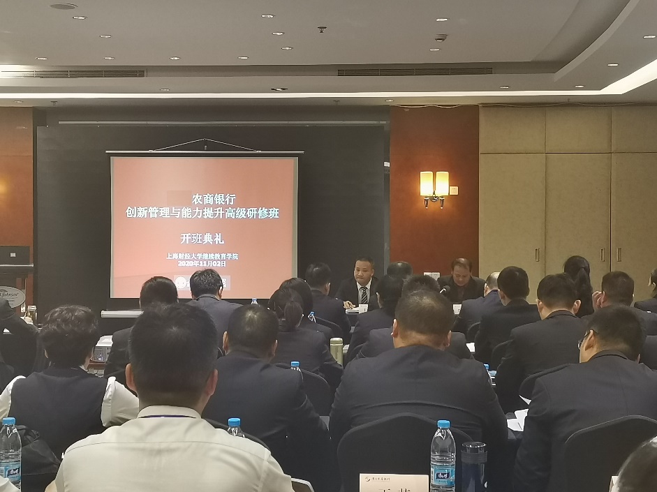 2020年11月02日,由某县农商银行、上海财经大学继续教育学院合作举办的“农商银行创新管理与能力提升高级研修班”开班仪式在我校举行。来自浙江省某县的53名农商银行高层干部参加了本次培训。农商银行党委书记、董事长王良新,上海财经大学继续教育学院副院长邵建利出席开班仪式。