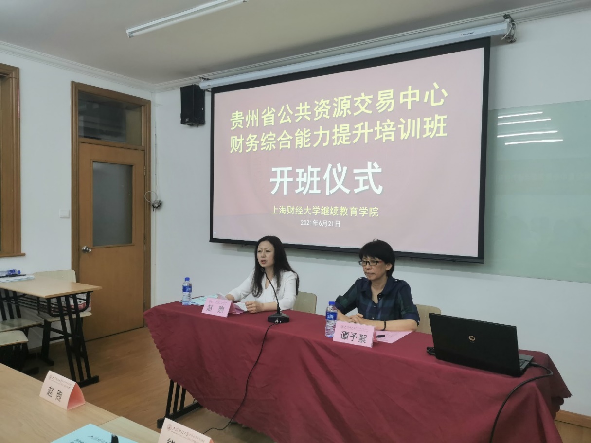 2021年6月21日,贵州省公共资源交易中心财务综合能力提升培训班在我校昆山路校区顺利开班。贵州省公共资源交易中心党组成员、副主任赵煦,上海财经大学继续教育学院院长谭予絮出席了本次开班仪式。