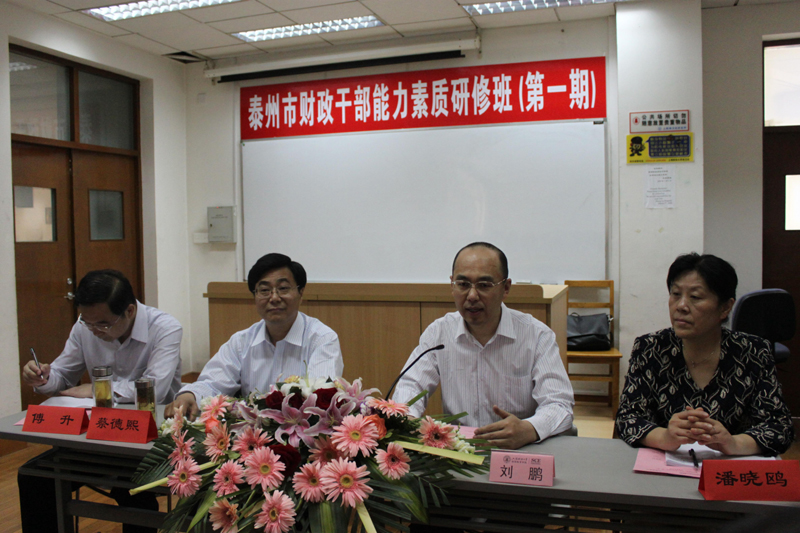泰州市财政局党组书记蔡德熙局长,泰州市财政局傅升副局长,泰州市财政局潘晓鸥副局长,上海财经大学继续教育学院院长刘鹏教授