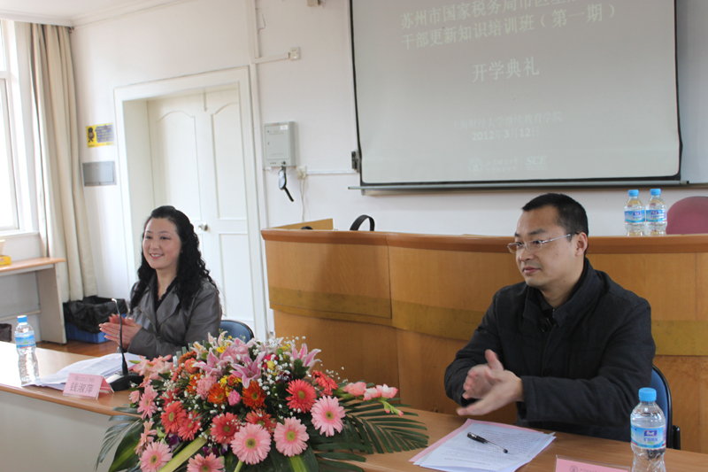 钱淑萍副院长首先代表学院对全体学员的到来表示热烈的欢迎,她谈到苏州市国家税务局连续两年选择与我院合作是对我院的信任和认可。她简要介绍了上海财经大学及继续教育学院的发展沿革,介绍了我院在高端项目培训方面取得的积极成果。她并表示学院会在师资、服务等诸方面全力以赴,努力为广大学员创造增进知识和加强交流的平台,提供细致全面的后勤服务,办好此次培训班。最后她祝愿学员们在我院培训期间生活顺利、学有所获。