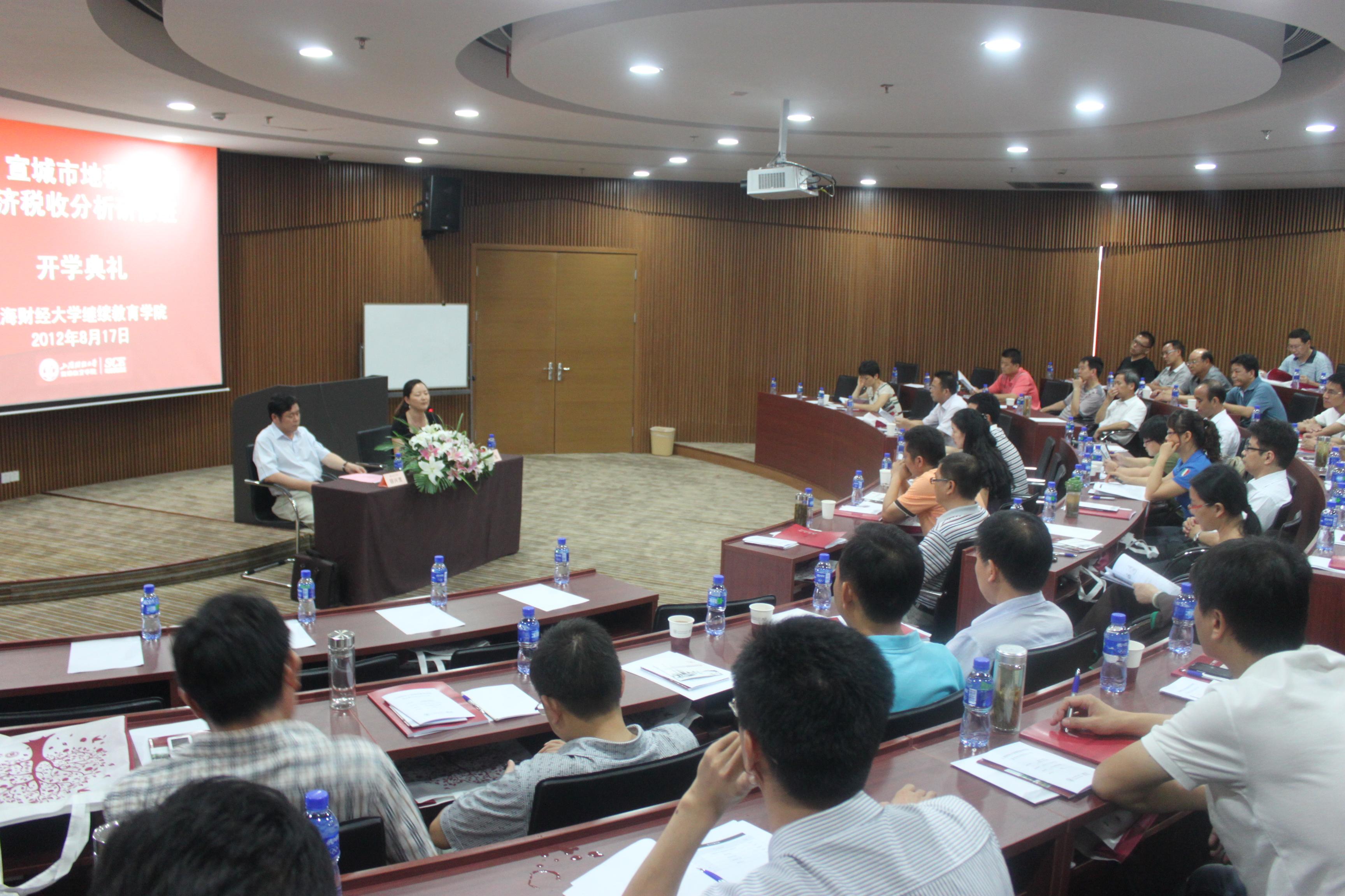 2012 年 8月 17 日下午,宣城市地税局经济税收分析研修班开学典礼在上海财经大学中山北一路校区博思楼405教室隆重举行。出席本次典礼的领导有安徽省宣城市地税局局党组书记局长胡兴宽先生,上海财经大学继续教育学院党总支书记粟芳教授。 出席开班典礼领导开班典礼现场全体学员