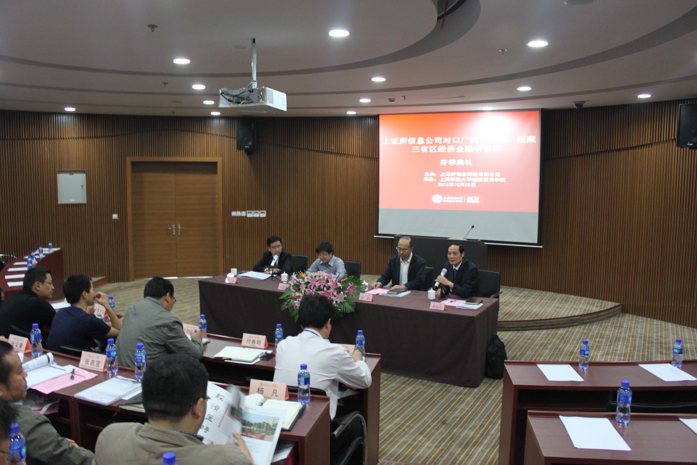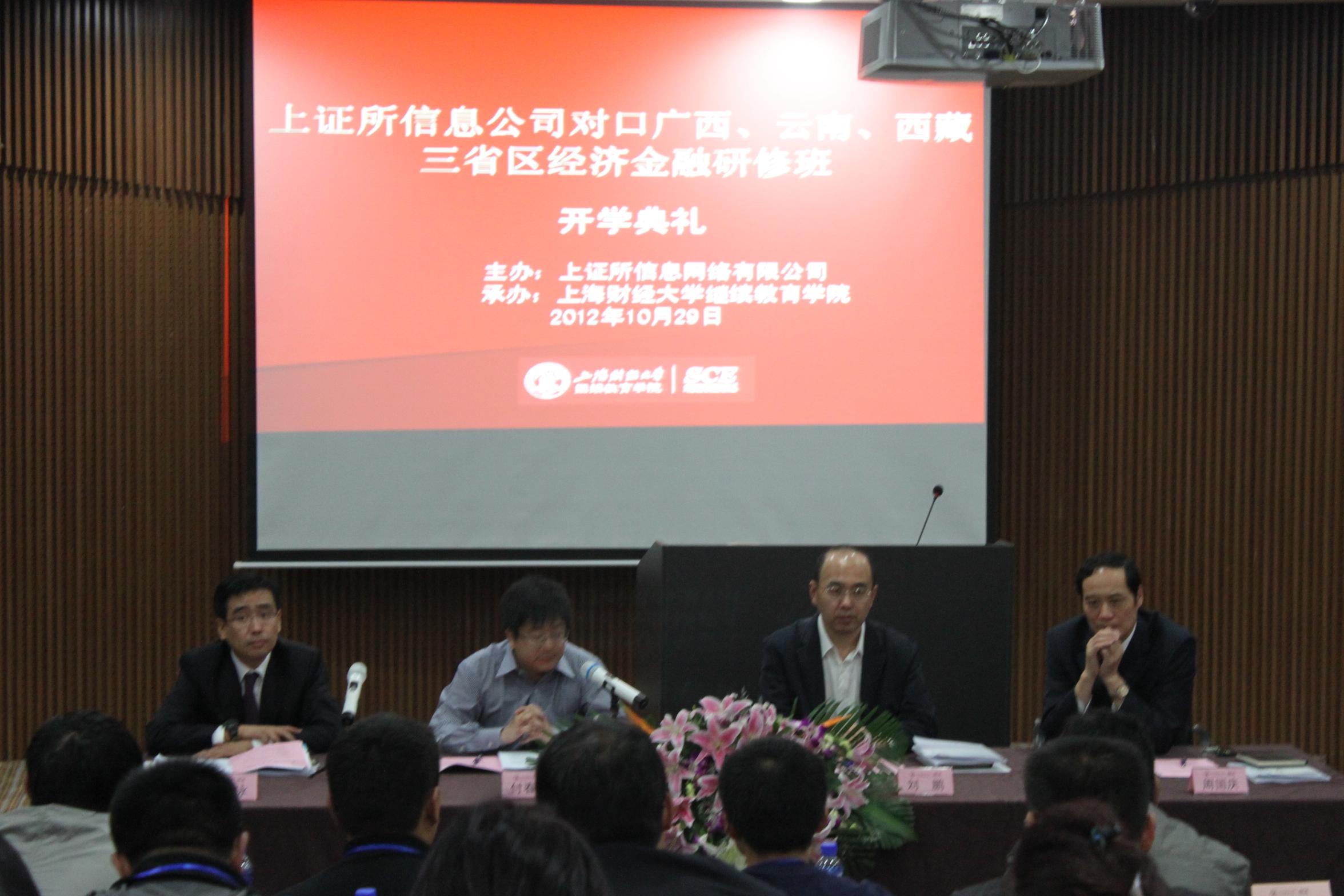 2012年10月29日上午“上证所信息公司对口广西、云南、西藏三省区经济金融研修班”开班典礼在上海财经大学中山北一路校区博思楼405报告厅隆重举行。 出席本次开班典礼的领导与嘉宾有:上证所信息网络有限公司董事长周国庆先生、上海财经大学继续教育学院院长刘鹏教授、上证所信息网络有限公司总经理王泳先生、中国证券监督管理委员会广西监管局办公室主任付春明先生。 开学典礼结束后,全体学员与领导嘉宾合影留念。 上证所信息公司对口广西、云南、西藏三省区经济金融研修班开班典礼现场上证所信息公司对口广西、云南、西藏三省区经济金融研修班开班典礼