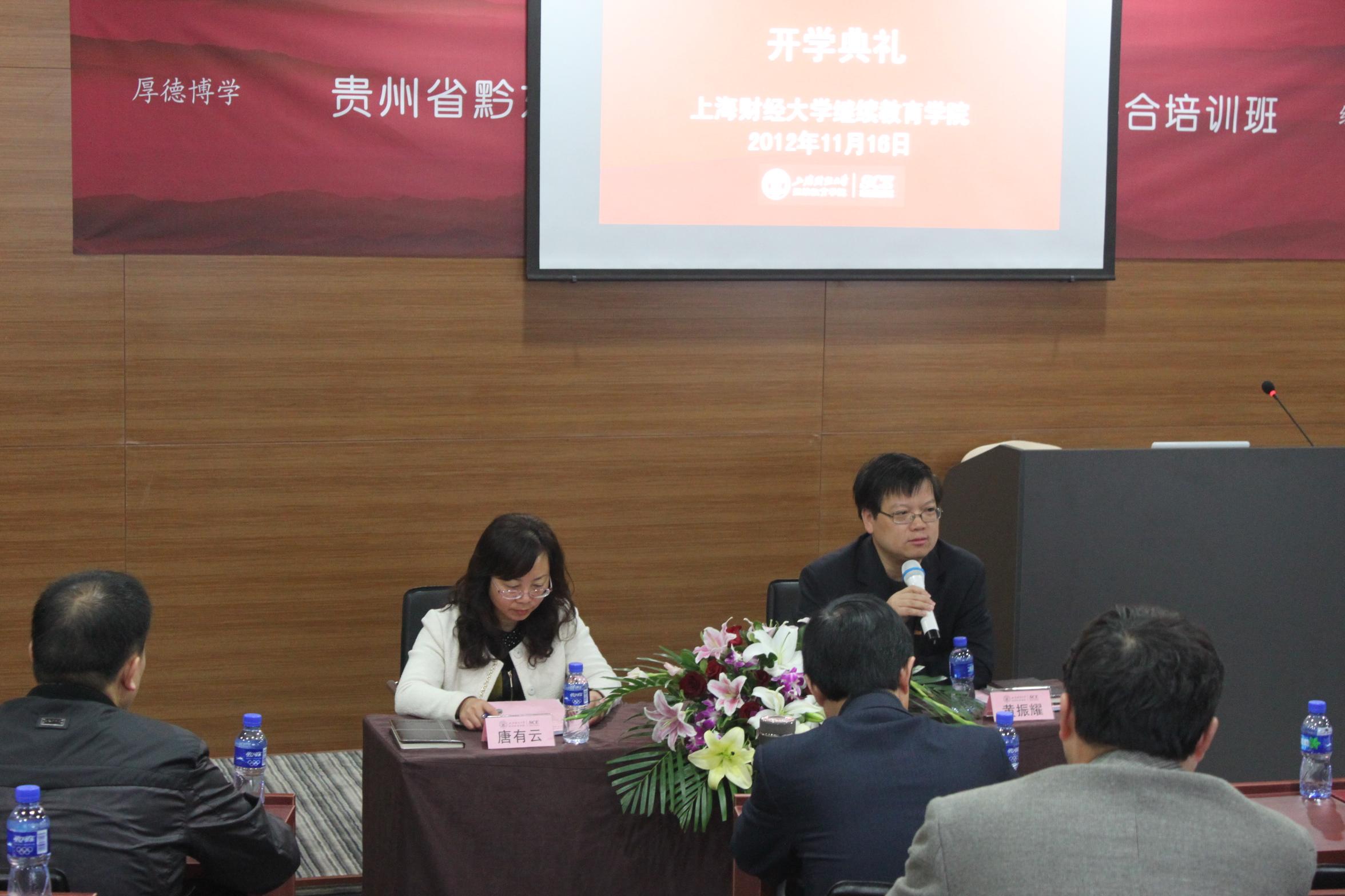 2012年11月16日,贵州省黔东南州财政系统财政业务知识综合培训班开班典礼在上海财经大学中山北一路校区博思楼403教室隆重举行。贵州省黔东南州财政局基财科科长唐有云女士以及上海财经大学继续教育学院培训部副主任黄振耀教授出席了开班典礼。