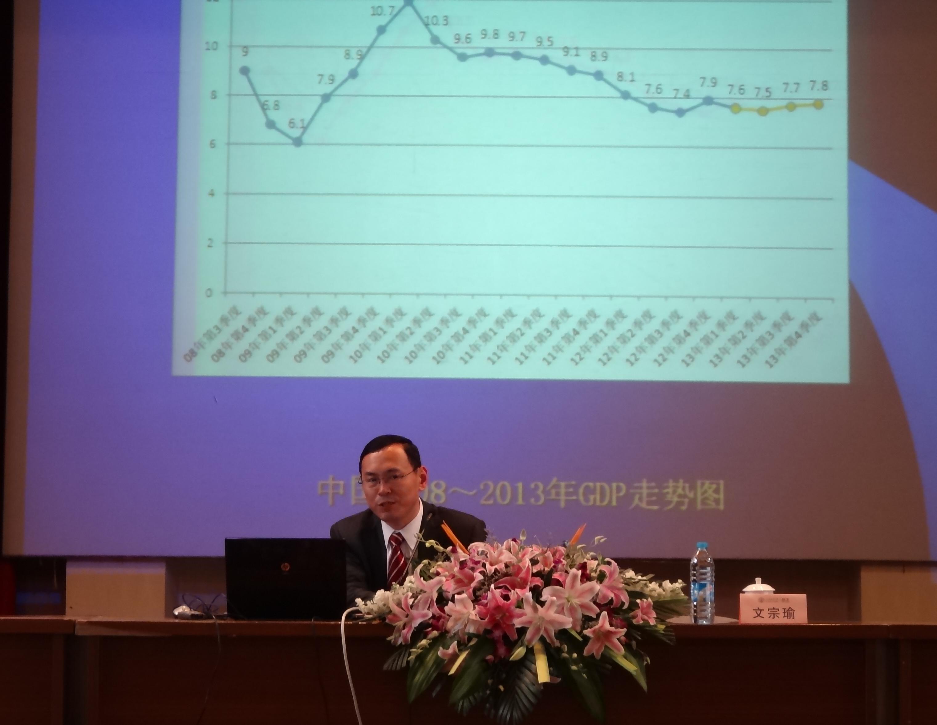 2013年4月26日下午,由上海财经大学继续教育学院主办的“上海财经大讲堂”系列讲座在中山北一路校区大礼堂举行,本期学院特邀中国著名经济学家、时任财政部财科所国有经济研究室主任文宗瑜博士,文宗瑜博士以“中国经济运行态势及政策导向分析” 的财经专题,做了精彩演讲。