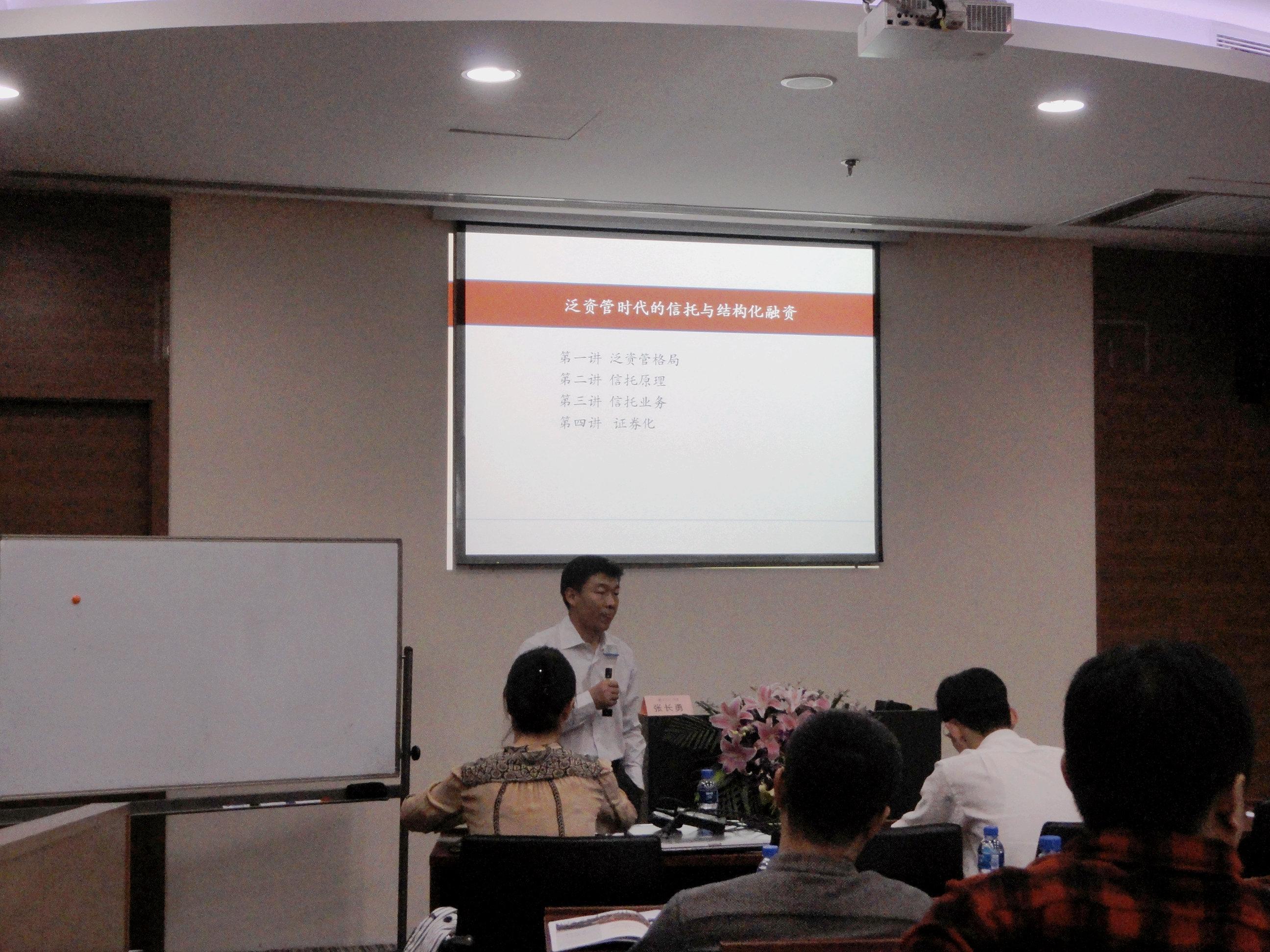 2013年5月17日下午14:00,上海财经大学投融资总裁班举办的开放课堂在上海财经大学中山北一路校区博思楼如期举行。本次讲座的主题为《信托及机构化融资》,授课老师为中投信托金融创新业务执行总经理张长勇先生。目前张老师的研究方向专注于信托、结构化融资及资产证券化等金融创新业务和公司重组、私募融资及上市等资本市场业务。