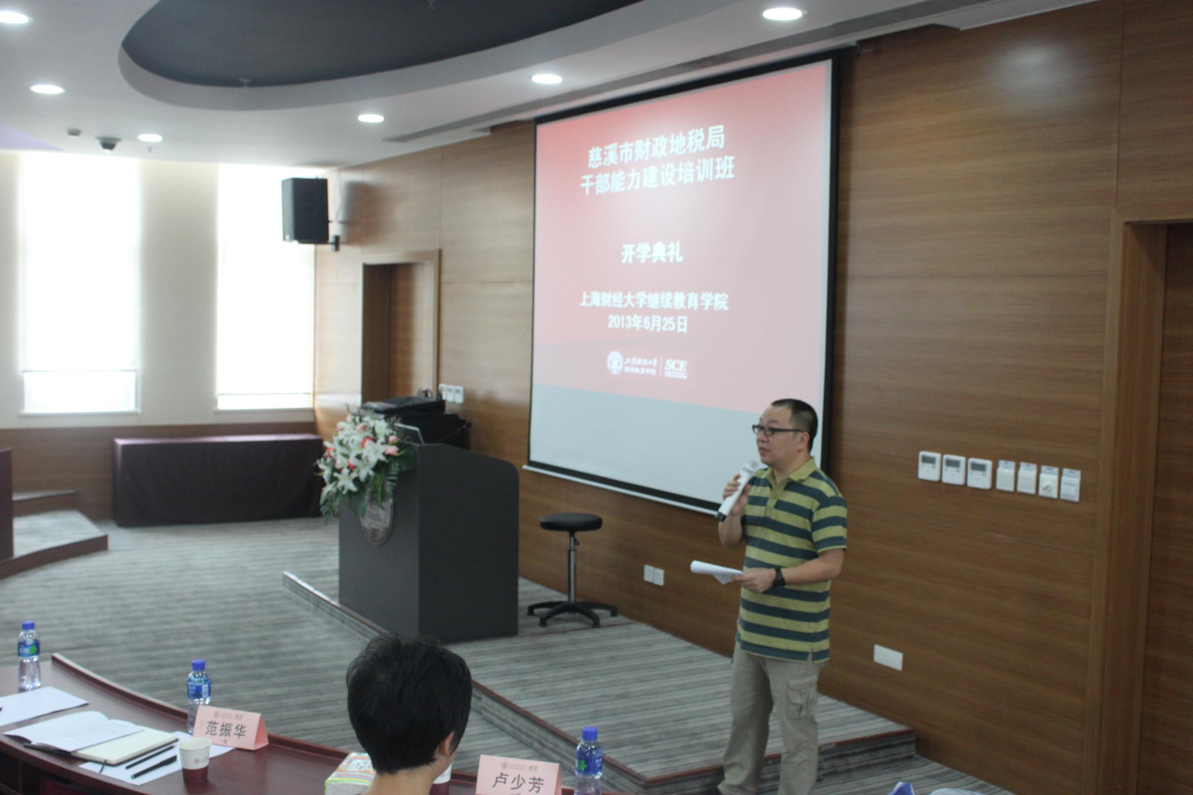 2013年6月25日下午2点,慈溪市财政地税局干部能力建设培训班开班典礼在我校中山北一路校区博思楼401报告厅隆重举行。 慈溪市财政地税局童士东先生做开班动员,他希望培训班全体学员能够抓住这次难得的机遇,认真学习、加强交流,同时也强调学员在校期间要遵守各项规章制度,圆满完成培训任务。 典礼结束后,全体学员合影留念。