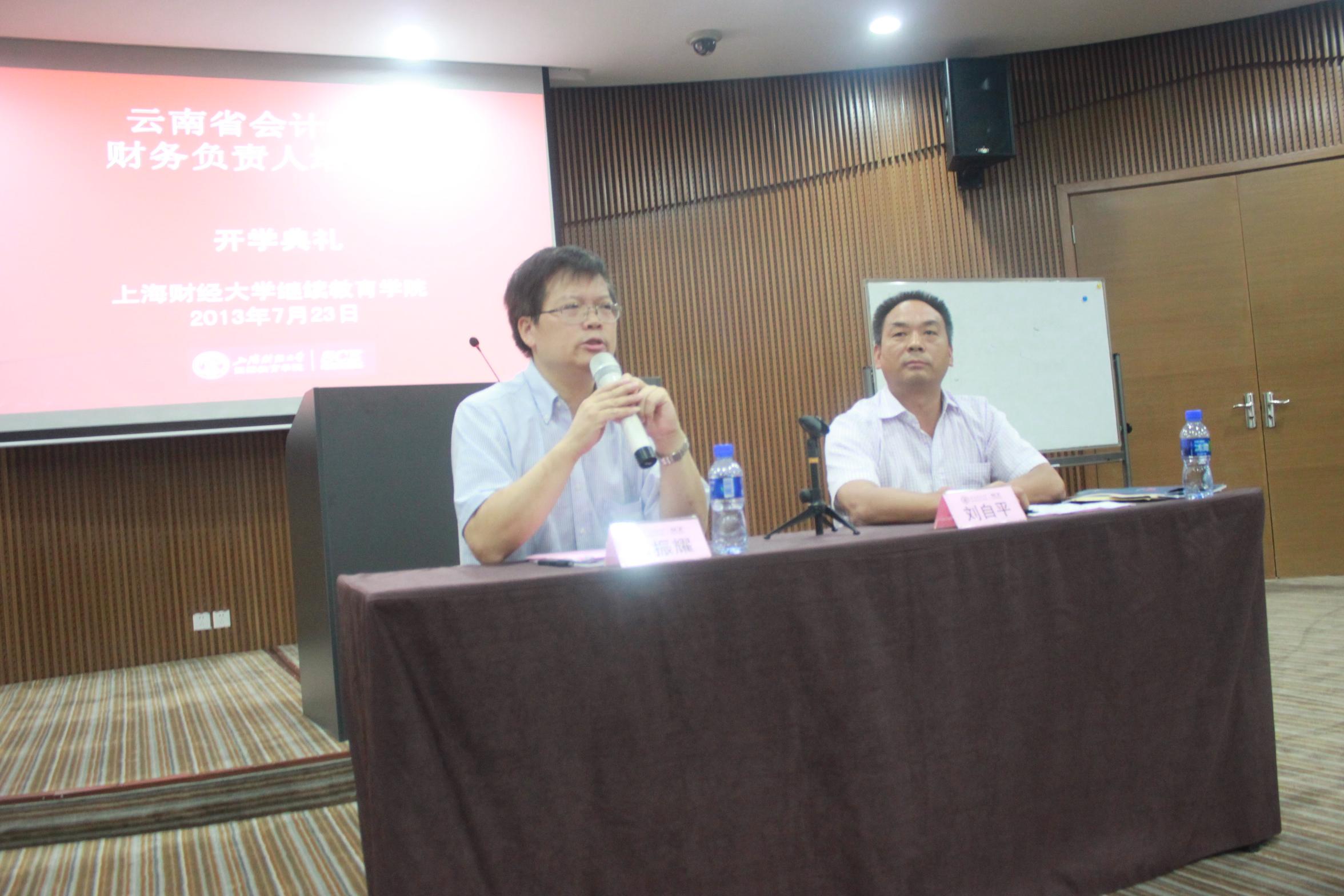2013年7月23日上午,云南省会计学会财务负责人培训班(第二期)开班典礼在我校中山北一路校区博思楼405教室隆重举行。出席本次开学典礼的领导嘉宾有:云南省财政厅会计处副调研员刘自平先生、上海财经大学继续教育学院院长助理黄振耀教授。