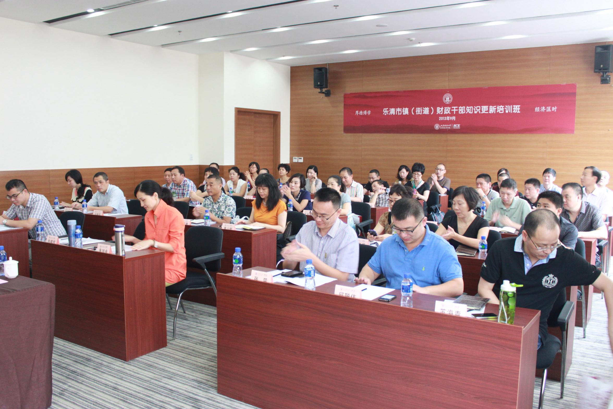 2013年9月23日上午,乐清市镇(街道)财政干部知识更新培训班典礼在我校中山北一路校区博思楼202报告厅隆重举行。出席本次开学典礼的嘉宾有:乐清市财政局预算局包建信局长,上海财经大学继续教育学院院长助理朱照定先生。