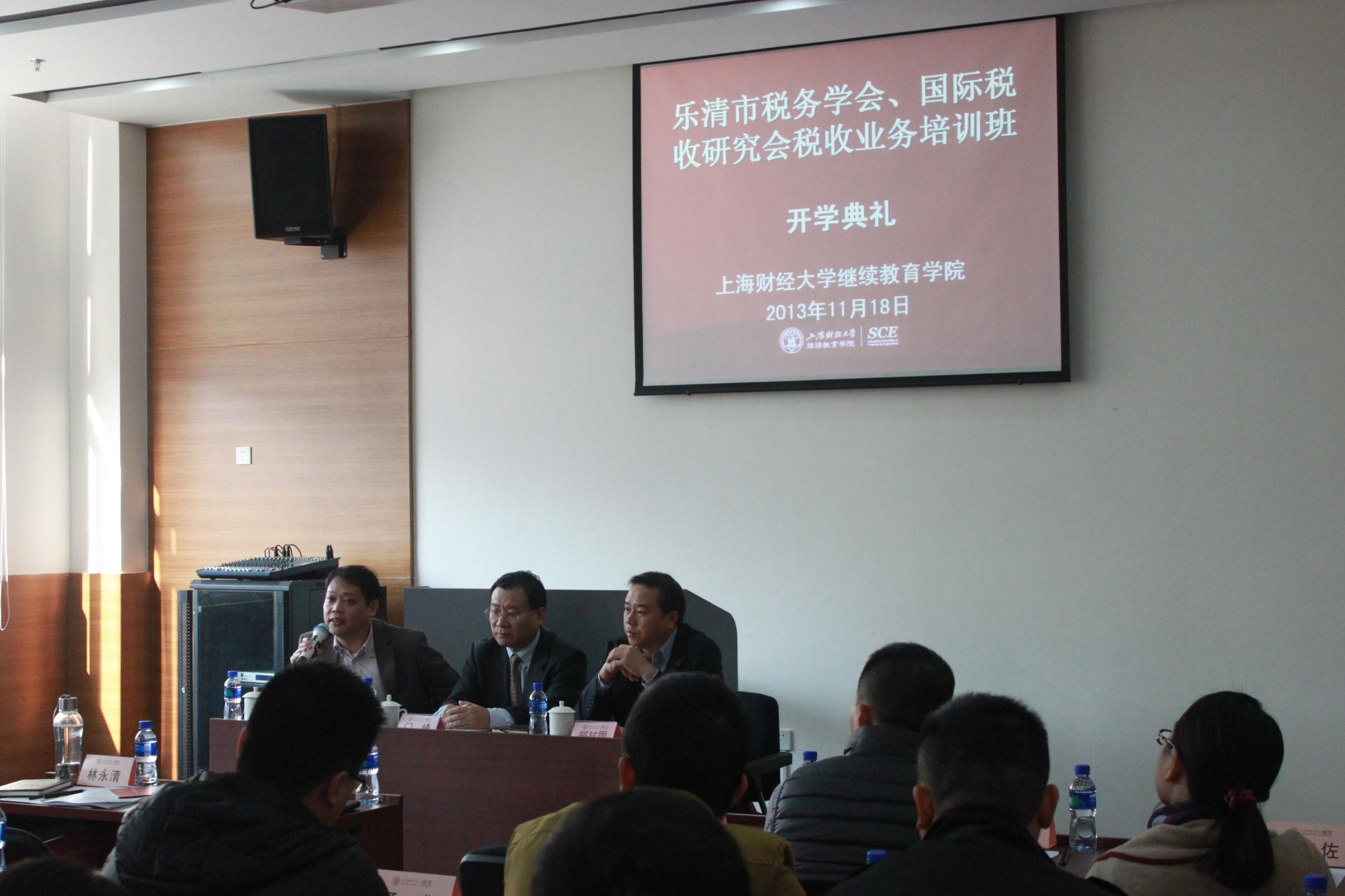 2013年11月18日上午,乐清市税务学会、国际税收研究会税收业务培训班典礼在我校中山北一路校区博思楼201报告厅隆重举行。出席本次开学典礼的嘉宾有:上海财经大学继续教育学院院长门峰教授、乐清国税局副局长林永清先生、乐清市地税局总会计师郑甘雨先生。