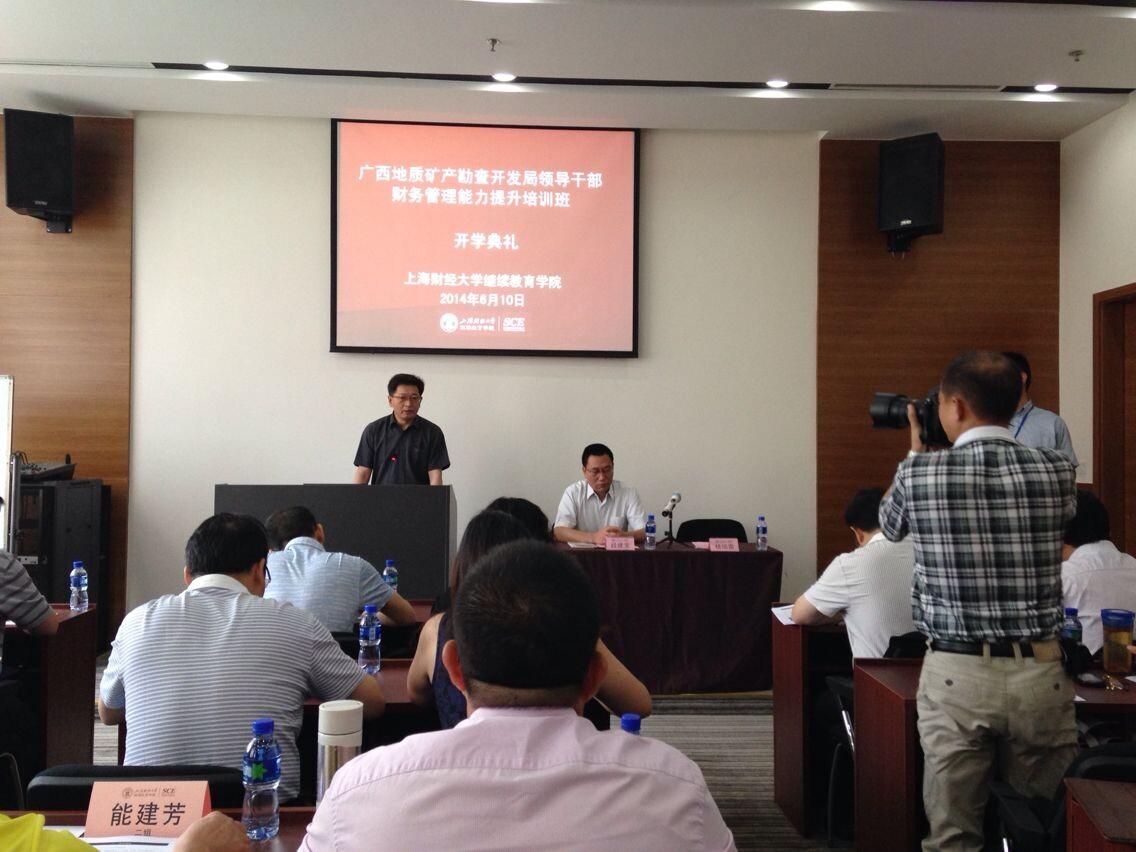 杨书记首先代表上海财经大学继续教育学院对全体学员的到来表示热烈的欢迎。他简要介绍了我校的发展历程以及继续教育学院在高层次非学历教育(培训)方面所取得的成绩。杨书记指出,此次培训班的举办具有重要的现实意义,旨在通过专家名师的理论讲解与丰富实用的社会实践,帮助学员解放思想,转变观念,交流经验,提高认识。最后,杨书记感谢广西地矿局对我院的信任,并保证学院将会配备强大的教学管理团队,为大家提供最好的服务,希望全体学员在上海财经大学继续教育学院学有所获、生活愉快。