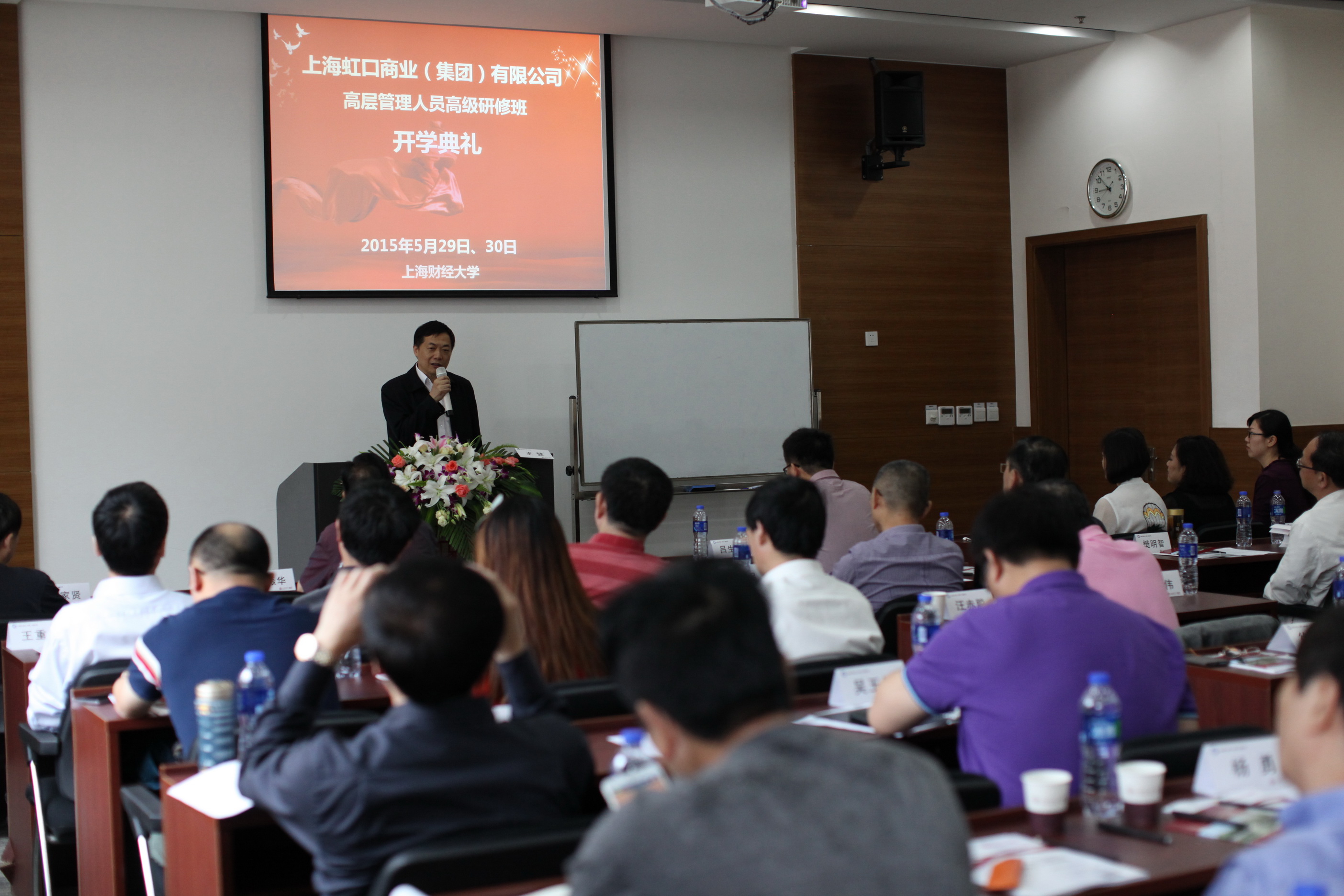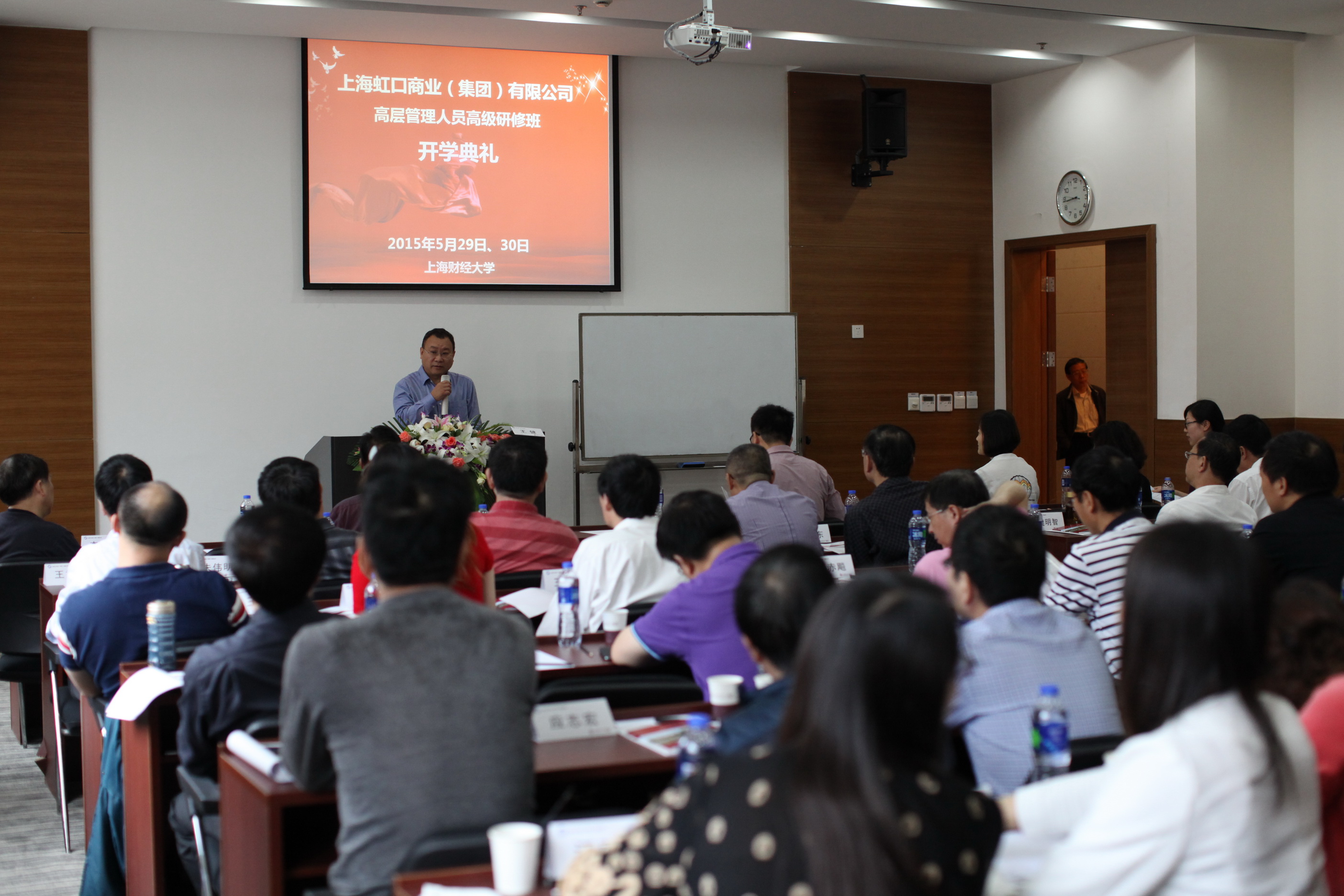 2015年5月29日,由上海虹口商业(集团)联合上海财经大学继续教育学院开办的上海虹口商业(集团)管理人员研修班在上海财经大学中山北一路校区举行。在开学典礼上,首先由上海财经大学继续教育学院门峰院长代表学院欢迎致辞,并对虹商集团表示感谢。接着,由虹商集团总经理戴万林为此次开班做动员,并对此次的学习提出了要求,并祝愿此次开班圆满成功。