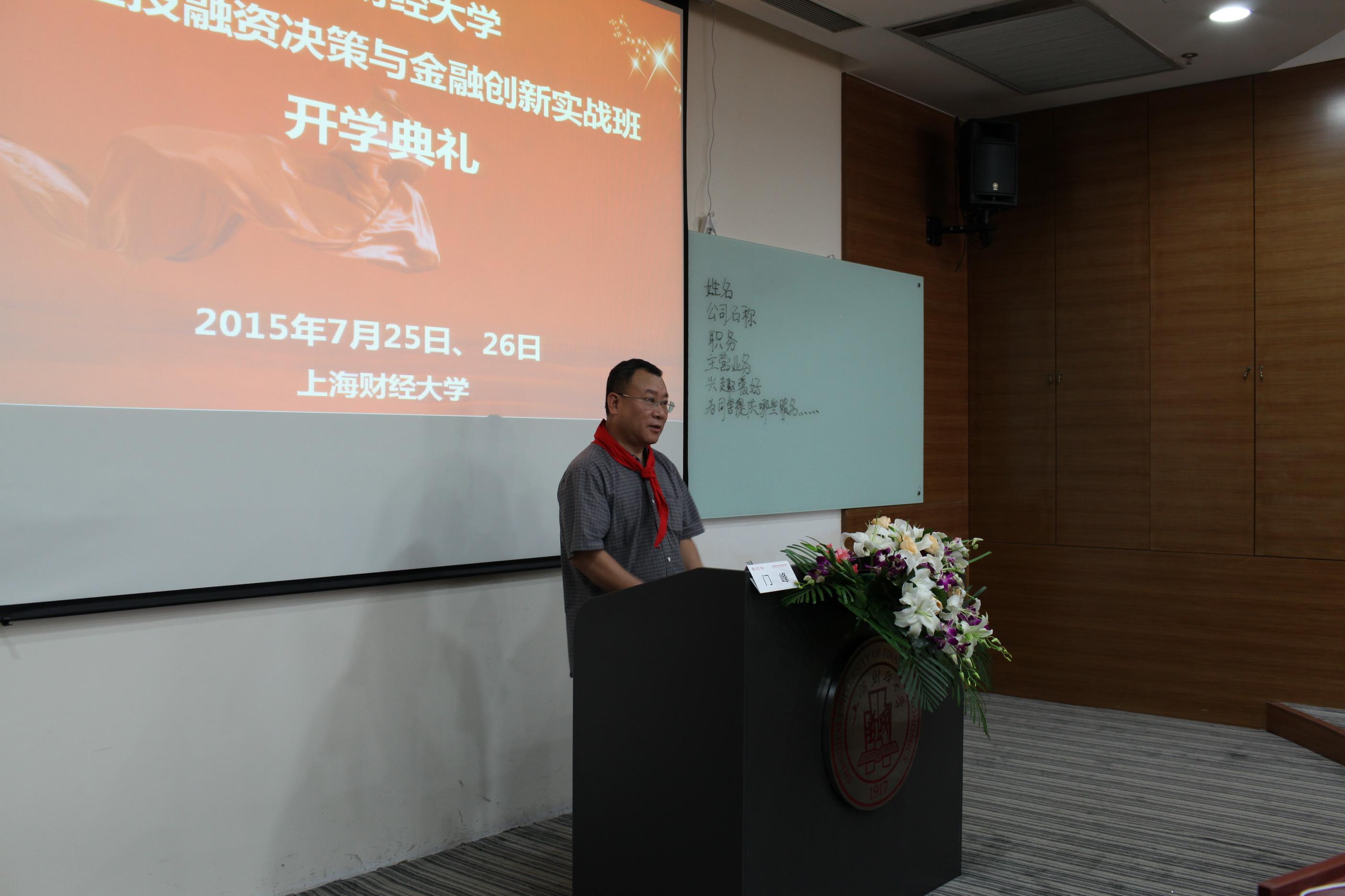 在这满目苍翠、繁花似锦的夏天,迎来了上海财经大学《企业投融资决策与金融创新班》四期的开学典礼,由班主任戴玲玲主持开学典礼,欢迎学员们走近上海财经大学的校门。今天大家佩戴起红领巾,又回到了当初的求知若渴的学生时代,在这里向各位新同学表示祝贺和热烈的欢迎。