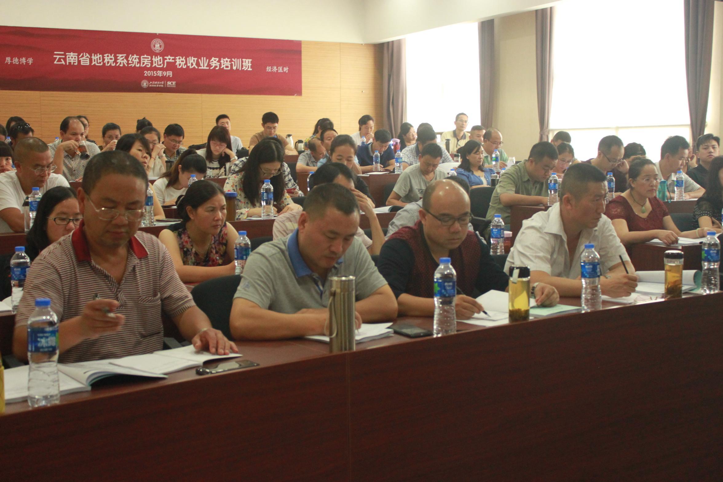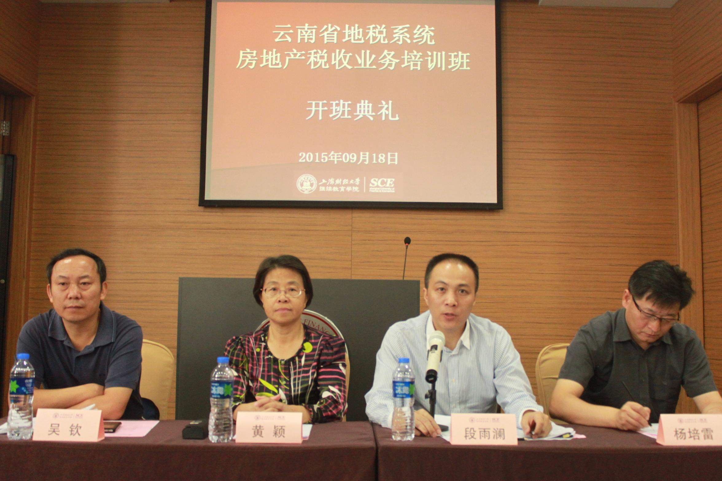 “云南省地税系统房地产税收业务培训班”开班典礼在我校中山北一路校区博思楼隆重举行。出席本次开班典礼的领导嘉宾有:云南省地方税务局党组成员、副局长段雨澜先生,上海财经大学副校长黄颖女士,云南省地方税务局税政三处处长吴钦先生,上海财经大学继续教育学院党总支书记杨培雷先生。开班典礼由上海财经大学继续教育学院总支书记杨培雷先生主持。