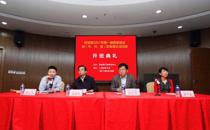 5月16日,由财政部干部教育中心主办、上海财经大学继续教育学院承办的“财政部2017年第一期西部地区地(市、州、盟)财政局长培训班”开班典礼在我校中山北一路369校区隆重举行。来自西部地区(地、市、州、盟)的59名财政局长参加了培训,财政部干部教育中心吴振鹏主任,财政部干部教育中心培训四处韩玉国处长,以及上海财经大学郑少华校长助理,上海财经大学继续教育学院谭予絮院长出席了开班典礼,开班典礼由,财政部干部教育中心培训四处韩玉国处长主持。西部地区地(市、州、盟)财政局长培训班自2000年西部大开发战略实施以来,至今已举办17年,共计举办了18期。