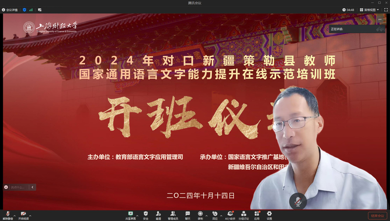 为贯彻落实全国语言文字会议精神,推动实施国家通用语言文字普及提升工程和推普助力乡村振兴计划,发挥国家语言文字推广基地示范带动辐射作用,提高民族地区、农村地区教师国家通用语言文字应用能力和教学水平,2024年10月14日上午,由教育部语言文字应用管理司主办、上海财经大学国家语言文字推广基地与新疆和田市策勒县教育局承办的策勒县教师国家通用语言文字能力提升在线示范培训班在上海财经大学中山北一路校区顺利开班。