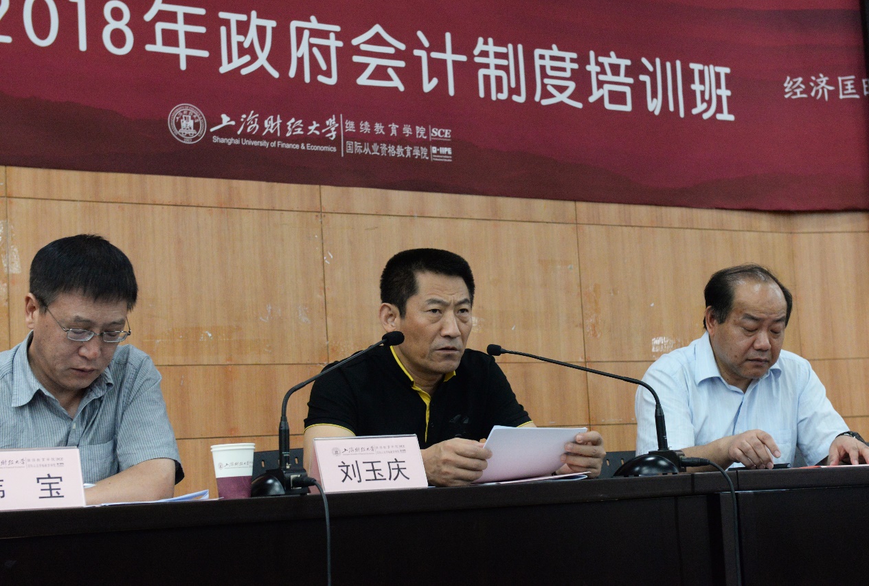 刘玉庆副局长在开班典礼上致辞。他首先代表公安部装备财务局,对本期培训班的开班表示热烈的祝贺,对来参加培训班的各位学员表示诚挚的欢迎,同时向对培训班给予大力支持和提供良好服务的上海财经大学的领导和老师们表示衷心的感谢!他指出,党的十八届三中全会提出了“建立权责发生制政府综合财务报告制度”的重大改革举措,2014年新修订的《预算法》对各级政府提出按年度编制以权责发生制为基础的政府综合财务报告的新要求。在新的形势下,必须对现行政府会计标准体系进行改革。改革后的政府会计制度对于提高政府会计信息质量、提升行政事业单位财务和预算管理水平、全面实施绩效管理、建立现代财政制度具有重要的政策支撑作用。在讲话中,他特别指出,本次培训在整体培训安排中凝聚多方的心血和智慧,从课程设置到教学安排都经过多次的沟通和调整,同时还特邀财政部负责起草改革方案和行业专家前来授课,希望培训班学员能够抓住这次难得的机遇,认真学习、深入思考,结合实地考察和交流讨论等,解放思想、转变观念、交流经验、提高认识,圆满完成培训任务。