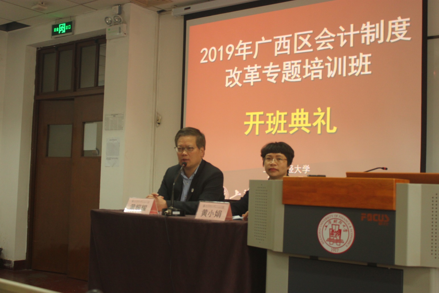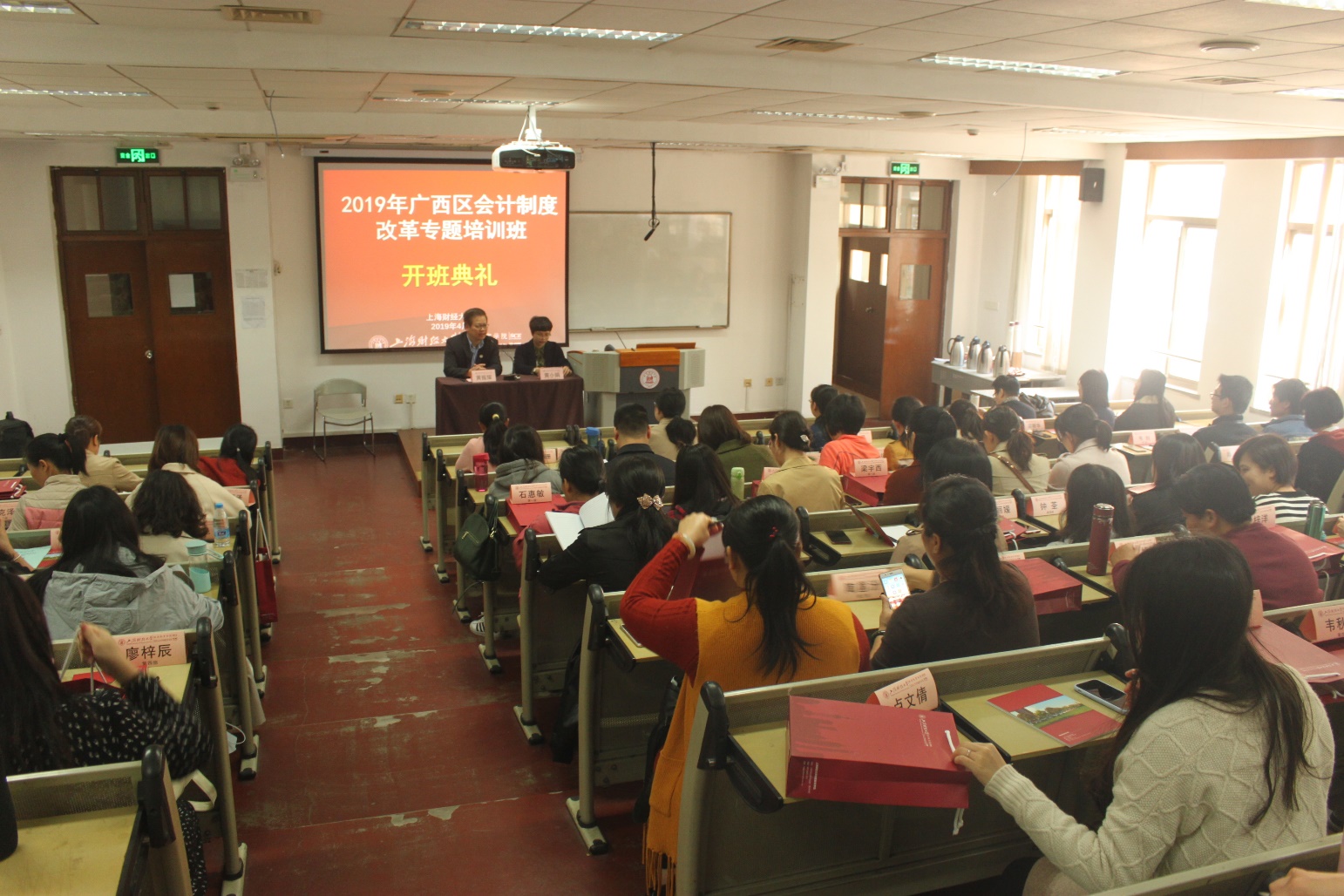 2019年4月15日,由广西壮族自治区退役军人培训中心人力资源培训部和上海财经大学继续教育学院合作举办的“2019年广西壮族自治区会计制度改革专题培训班”开班典礼在我校中山北一路校区举行。出席本次开班典礼的领导有:广西壮族自治区退役军人培训中心人力资源培训部副部长黄小娟女士,上海财经大学继续教育学院培训部主任黄振耀教授。